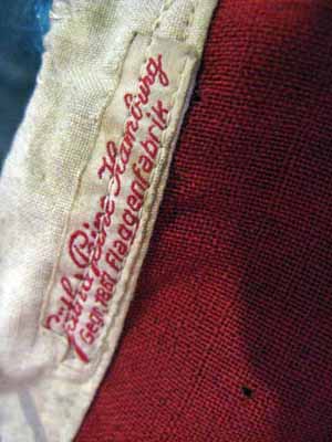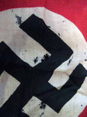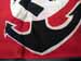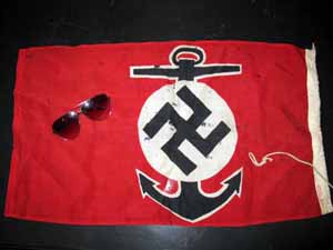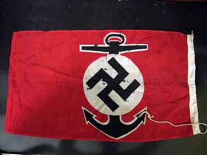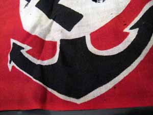 BANDIERA MARINA MERCANTILE NAZISTA Germania, prima metá XX Sec. In lanetta, del primo tipo, con il disco bianco racchiudente la svastica ,il tutto attraversato da un ancora , riportato, al margine destro rinforzo in tela recante il marchio della casa costruttrice) Piccoli strappi, buone condizioni.