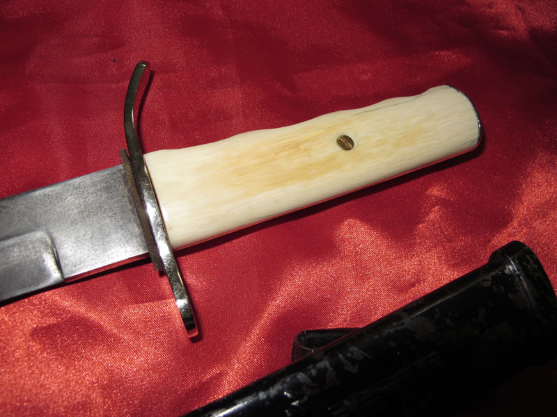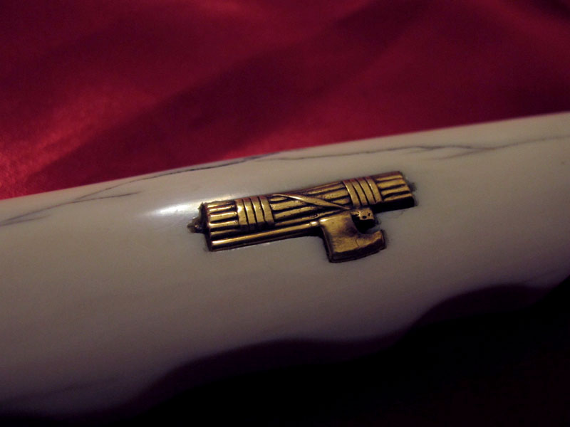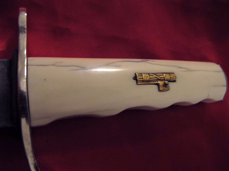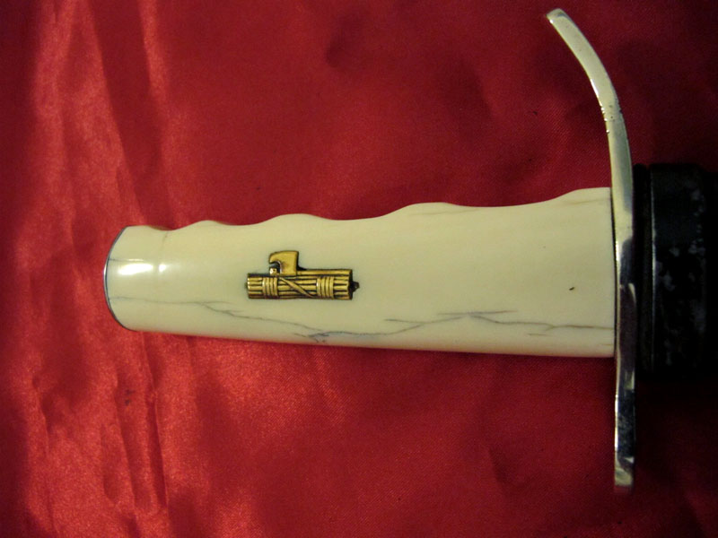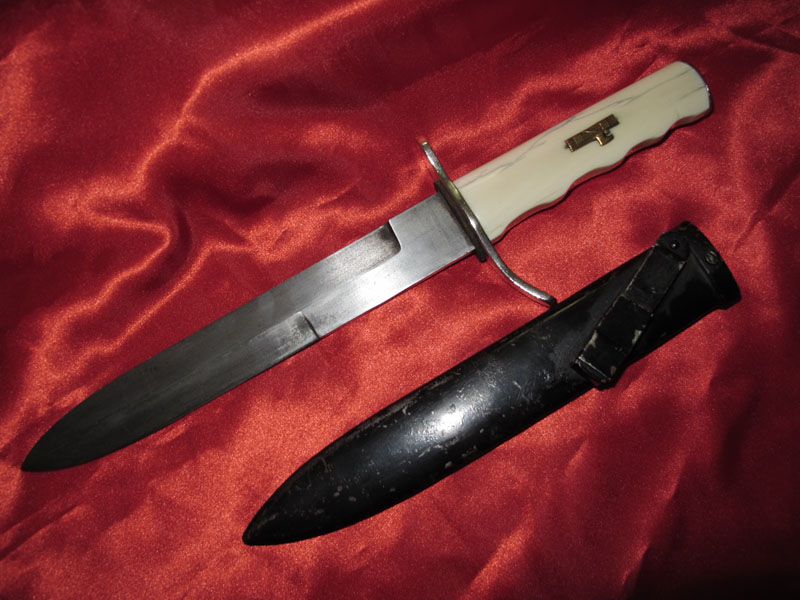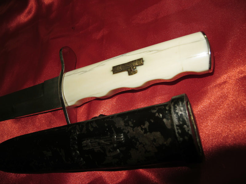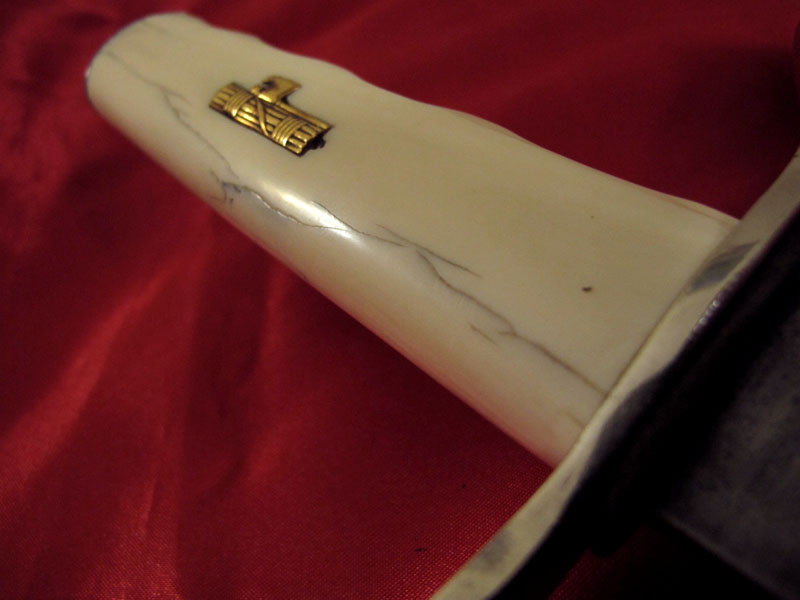 Rarissimo e ormai quasi introvabile pugnale da marcia della Milizia Volontaria Sicurezza Nazionale ( modello con impugnatura bianca da Generale) l'impugnatura č realizzata in pregiato avorio ,con al centro l'emblema ottonato del fascio littorio , La lama, e' a un filo e due terzi circa, a sezione di losanga con fili leggermente divergenti che le danno all'ultimo terzo una larghezza superiore a quella del tallone. Il pugnale, in ottime condizioni di conservazione, ha tuttavia un aspetto "vissuto" essendo stato sicuramente portato a lungo.