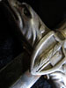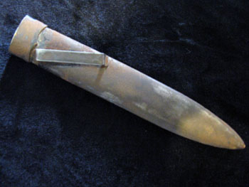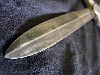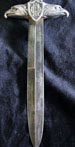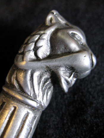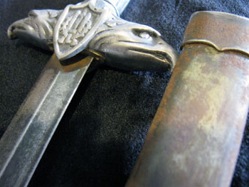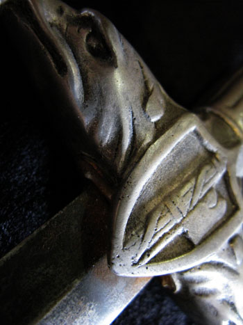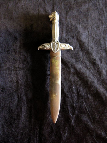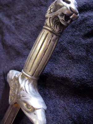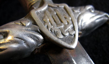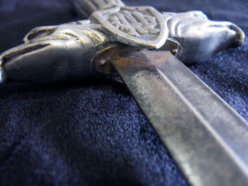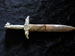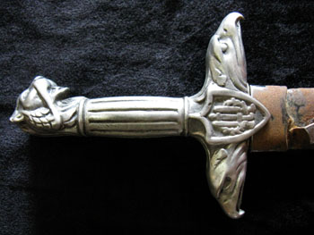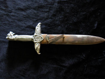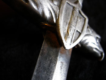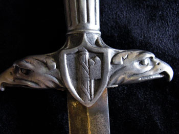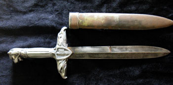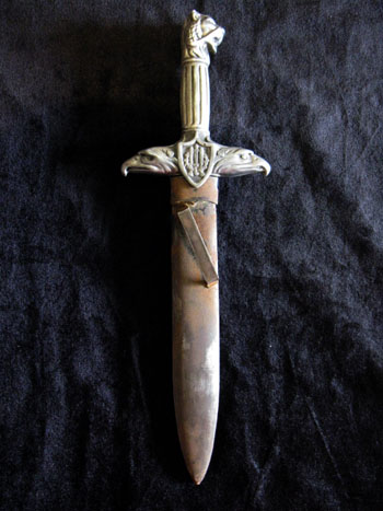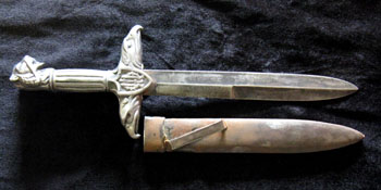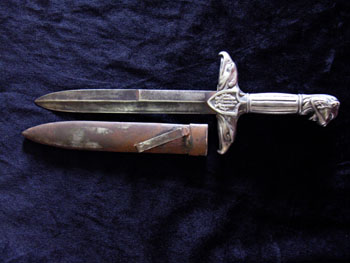 Pugnale Mutilati Rarissimo e ormai quasi introvabile pugnale per la Legione Mutilati e Invalidi della Milizia Volontaria Sicurezza Nazionale ( modello di colore argento per ufficiali ) realizzato in zama ramata e quindi argentata. La lama, marcata "Frosolone", e' a un filo e due terzi circa, a sezione di losanga con fili leggermente divergenti che le danno all'ultimo terzo una larghezza superiore a quella del tallone. Il manico e' fuso in un solo pezzo, a forma di testa di leone con i rami di guardia a testa d'aquila; al centro della crocera e' posto su entrambi i lati, uno scudetto racchiudente da un lato un fascio littorio, dall'altro il fregio dei Mutilati con le tre baionette intrecciate alla corona di filo spinato. Il fodero con cappa appuntita al centro, porta un attacco di ordinanza per il fissaggio al cinturone ( vedi volume "Pugnali e coltelli italiani" di Cesare Calamandrei, pag. 202 ). Il pugnale, in ottime condizioni di conservazione, ha tuttavia un aspetto "vissuto" essendo stato sicuramente portato a lungo. L'Associazione Nazionale Mutilati nacque a Milano nell'aprile del '17 quando un gruppo di degenti nelle cliniche intuivano e discutevano il problema del domani dei reduci minorati di guerra e delle famiglie dei Caduti nel suo duplice aspetto di problema materiale e spirituale.