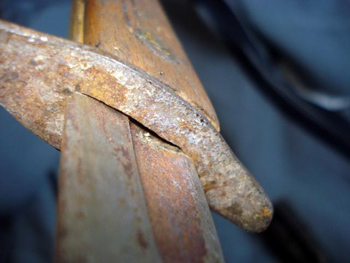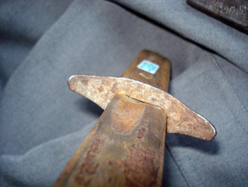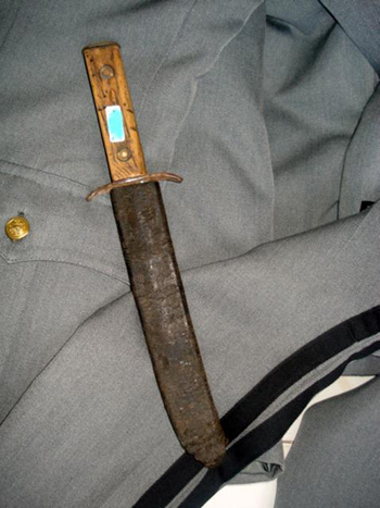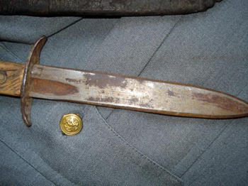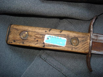 Italia, XX Sec. Pugnale da Ardito, ritrovamento "da ghiacciaio": lama ad un filo e punta con sgusci costruito dalla parte alta della baionetta Vetterli, guardia in ferro, guance di legno rivettate, "resti" del fodero in cuoio indurito "dal tempo e dalle intemperie"; assolutamente bello