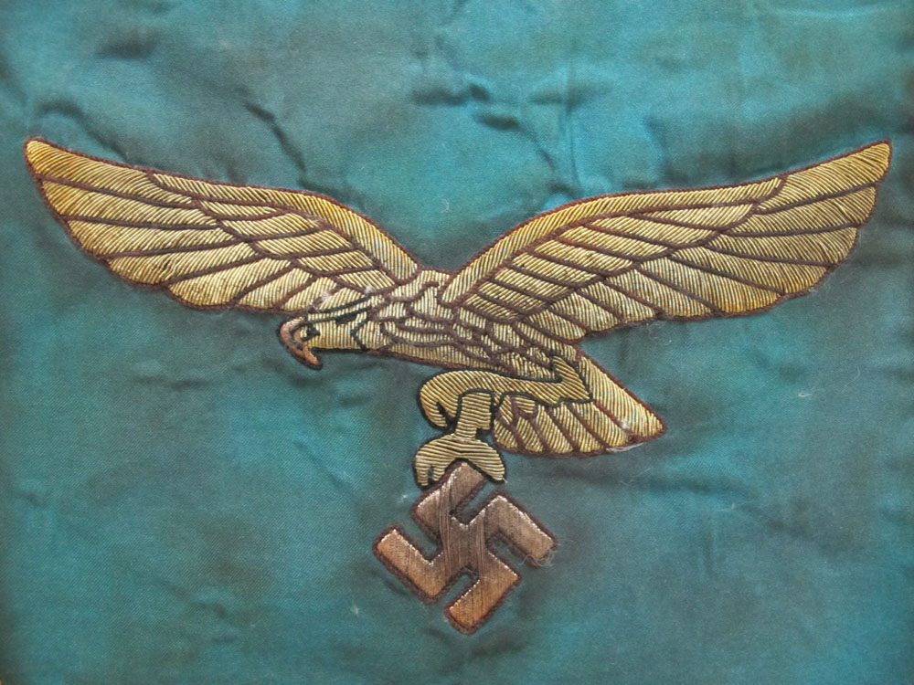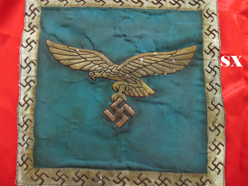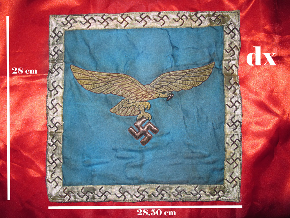 STENDARDO Della legione condor Germania, prima metá XX Sec. favoloso stendardo con insegna Della legione condor di forma quadrata con entrambi i lati ricamata la classica aquila della Luftwaffe , il tutto sotto pannato di seta blu , lungo tutto il perimetro scorre una fa scia dorata con swastiche di tonalità rossa Lotto veramente raro che non può mancare in una collezione esigente .